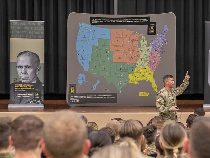 It's a lesson which has become ingrained in American military thinking. Take a good look at the poster of Marshall on the stage at this ROTC seminar: